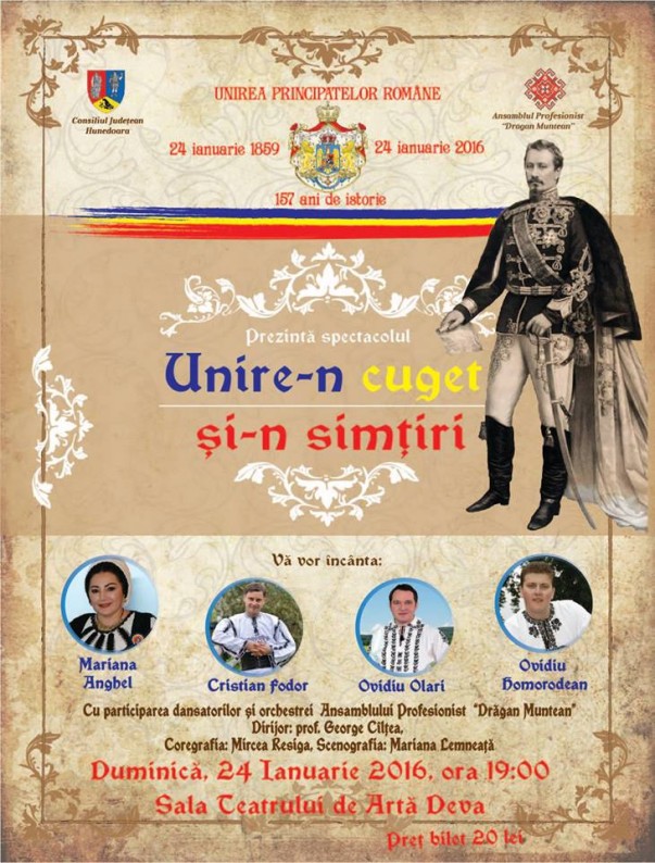 Ansamblul profesionist „Drăgan Muntean” pregăteşte hunedorenilor un program aparte dedicat Micii Uniri. File din istoria românilor vor fi conturate artistic pe scena Teatrului de Artă din Deva, duminică 24 ianuarie, de la ora 19:00, prin prezenţa soliştilor Mariana Anghel, Cristian Fodor, Ovidiu Olari şi Ovidiu Homorodean, formaţiei de dansuri pregătită de coregraful Mircea Resiga şi orchestrei condusă de prof. George Cîlţea. Scenografia semnată de Mariana Lemneaţă aduce în centrul întregului spectacol personajul domnitorului Alexandru Ioan Cuza. Detalii vom avea de la managerul Ansamblului, domnul Cristian Fodor, într-un interviu realizat de Daniela Băcilă, vineri, în jurul orei 9:30.
