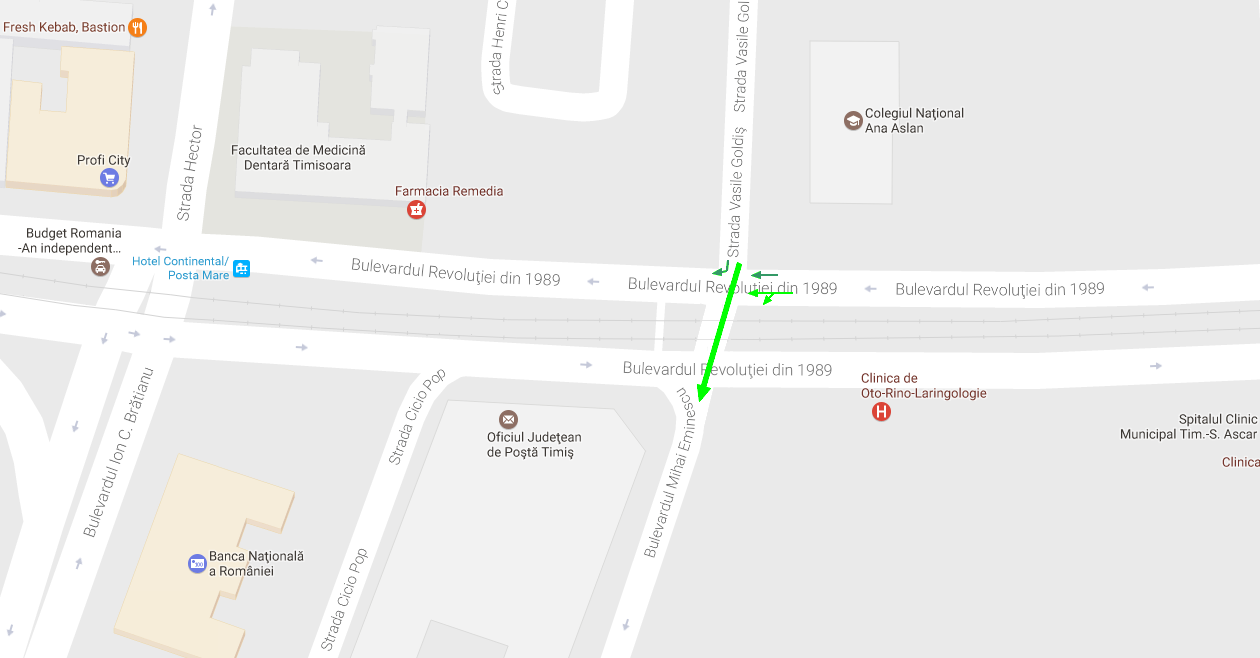 “Comisia de Circulaţie din cadrul Primăriei municipiului Timişoara a decis instituirea următoarelor măsuri: efectuarea virajului la stânga de pe bulevardul Revoluţiei 1989 pe str. Mihai Eminescu; efectuarea traversării peste linia de tramvai în zona intersecţiei bulevardul Revoluţiei cu str. Vasile Goldiş”, au anunțat reprezentanții Primăriei Timișoara.