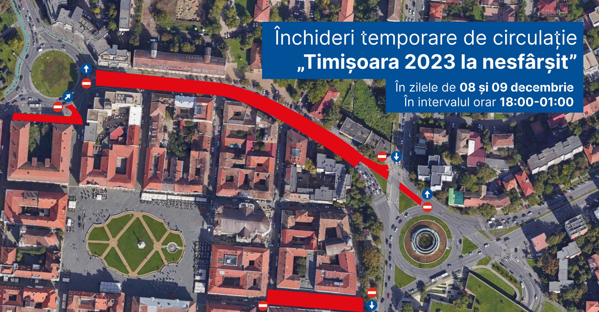👉 în perioada 7.12 (ora 17:00) – 10.12 (ora 10:00) se restricționează traficul rutier pe străzile: Palanca, George Coșbuc, Paul Chinezu, Matei Corvin, Regimentul 5 Vânători, Sergent Constantin Mușat, respectiv breteaua existentă în Piața Mărăști în spatele stației S.T.P.T., Piața Țepeș Vodă, strada General Traian Doda, Episcop Augustin Pacha, Eugeniu de Savoya, Florimund Mercy, Vasile Alecsandri, Emanoil Ungureanu, Gheorghe Lazăr (Zona Cetate) și strada General Eremia Grigorescu;