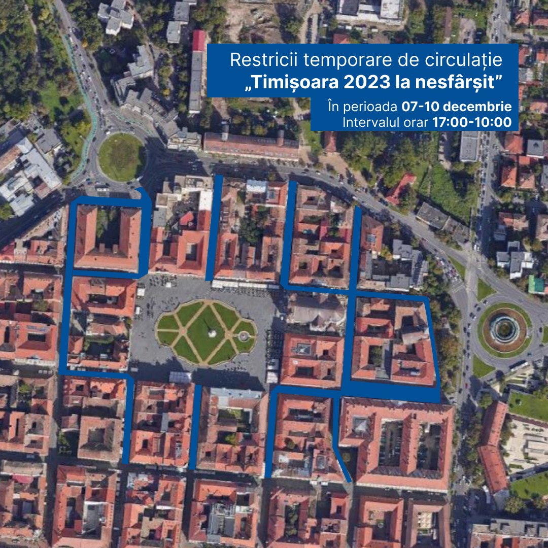 Totodată, pentru desfășurarea în siguranță a evenimentului „Timișoara 2023 la nesfârșit”, primăria a hotărât ridicarea teraselor din zona Cetate, inclusiv Piața Libertății și str. Alba Iulia, în perioada 6 – 10 decembrie.